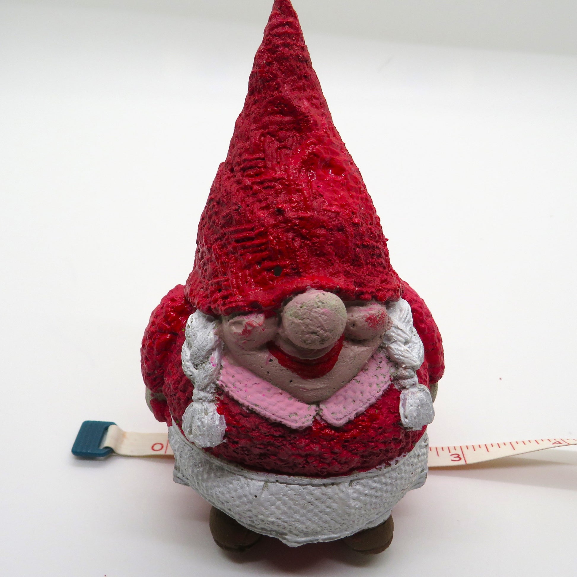 This jolly girl gnome has braids, rosy cheeks, an apron, and a pointed hat. This 3-D figure brings a smile to your home or garden. This is a splendid addition to any gnome collection or garden. The cement is durable for indoor or outdoor use!