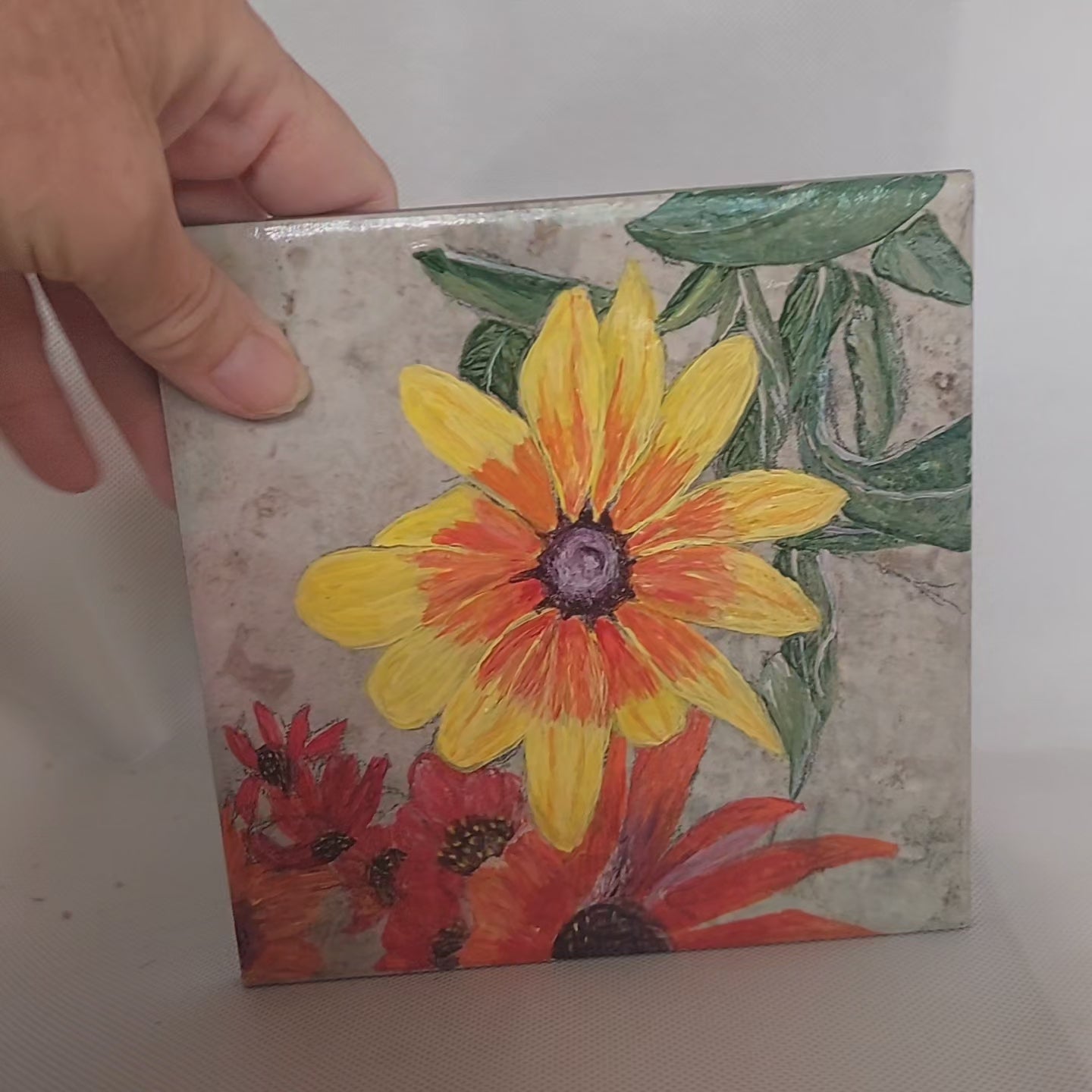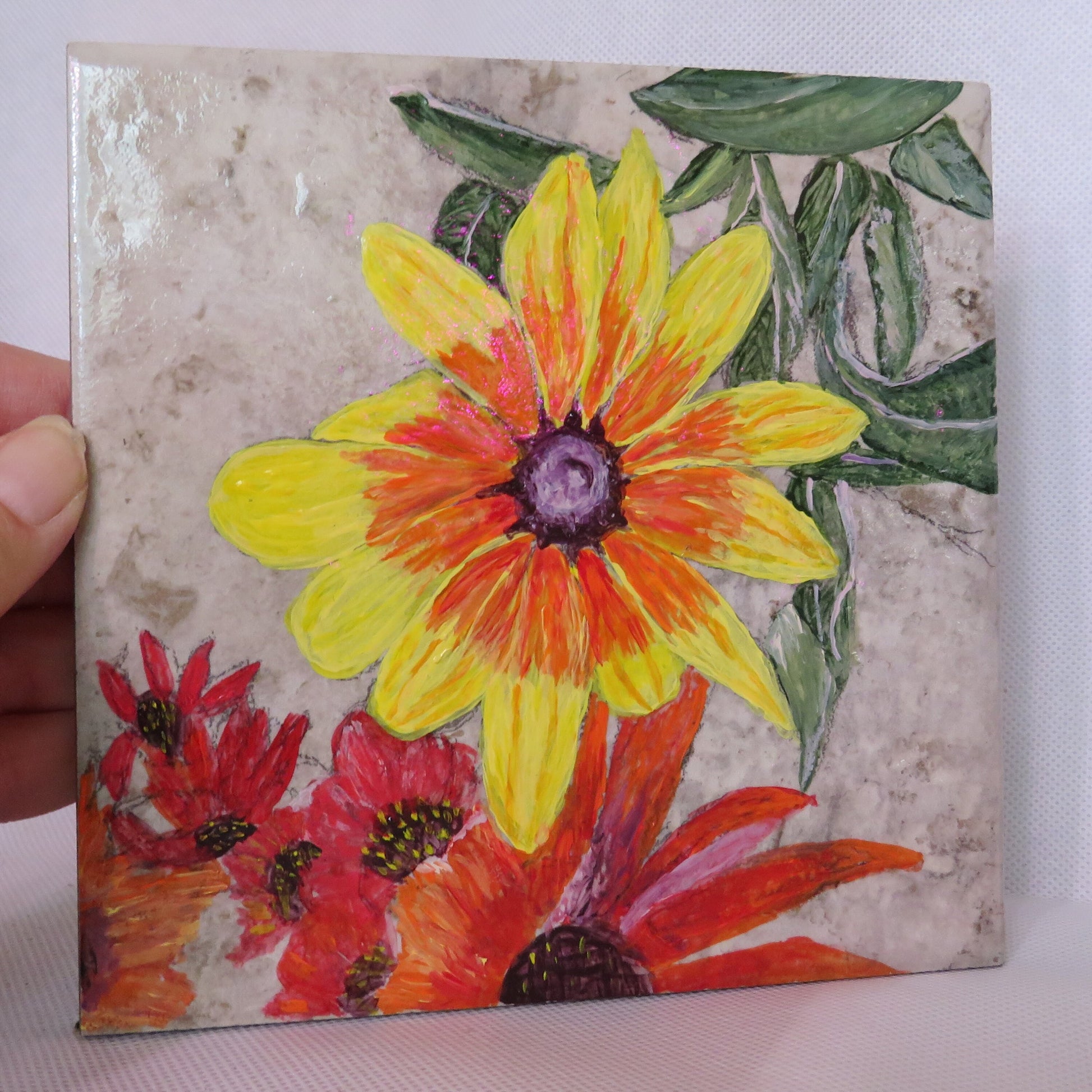 Brighten your kitchen with this unique, hand-painted 6x6 inch ceramic tile trivet, boasting a beautiful illustration of yellow and orange coneflowers. Each trivet is a miniature piece of art, meticulously crafted with attention to detail. The rich, warm hues bring a pop of color to any setting, turning an everyday item into a conversation piece. Not only does this trivet protect your surfaces from heat, but it also serves as a delightful display piece when not in use. The durable ceramic ensures longevity, making it an ideal gift or a timeless addition to your own home. Don't miss out on this wonderful blend of functionality and artistry!