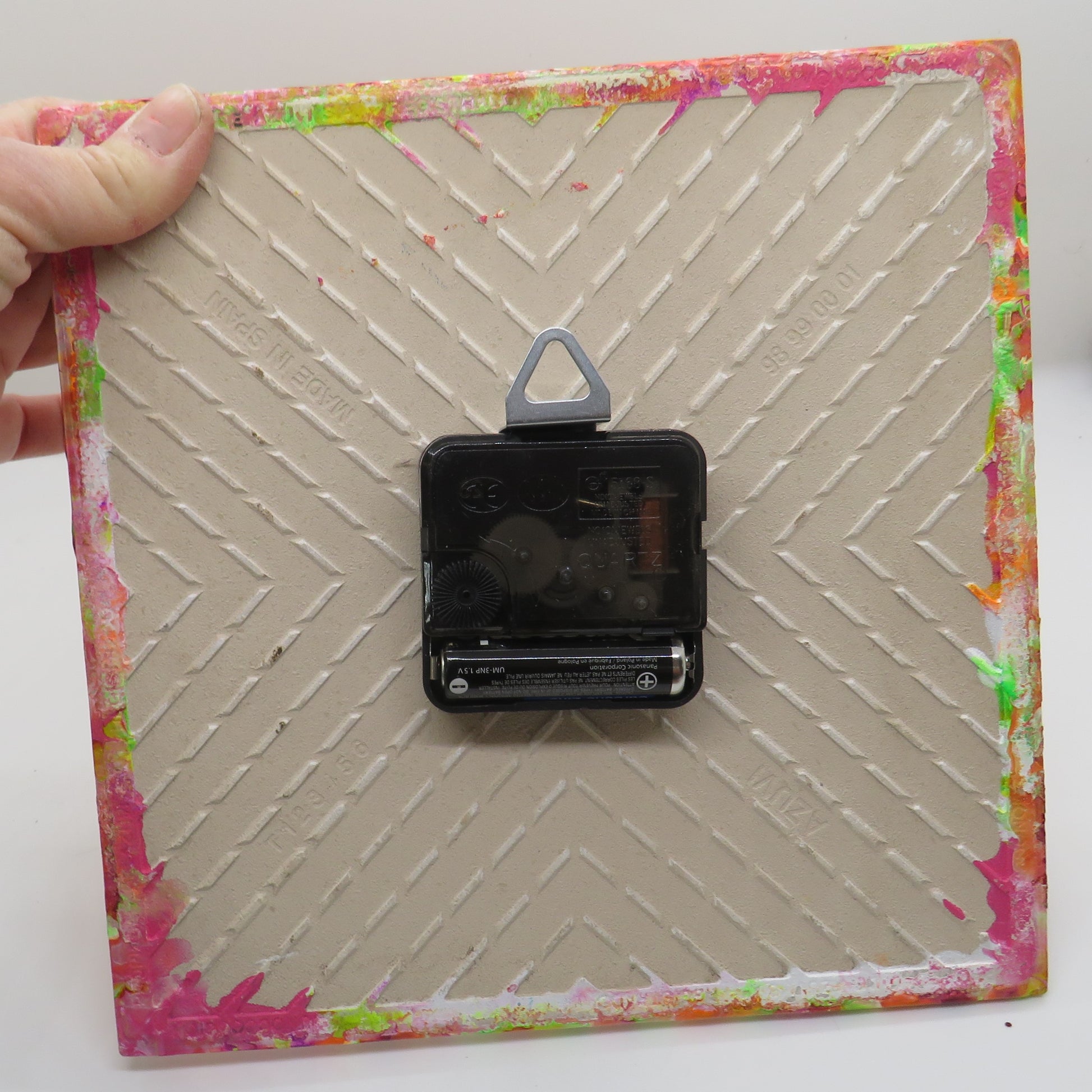 Bring a splash of vivid color to your space with our unique Neon Flower design pour paint clock! This 8x8 inch handmade timepiece is not just functional; it's a piece of art that tells a story. Crafted from recycled Habitat for Humanity ceramic tiles, each clock features a distinctive neon swirl pattern that ensures no two are alike. Whether hanging on your wall or displayed on a desk with its optional stand, this clock is sure to captivate and spark conversations. It's perfect for adding a pop of brightness to any room and a thoughtful gift for eco-conscious art lovers. Don't just tell time; celebrate it with this one-of-a-kind, handcrafted clock.