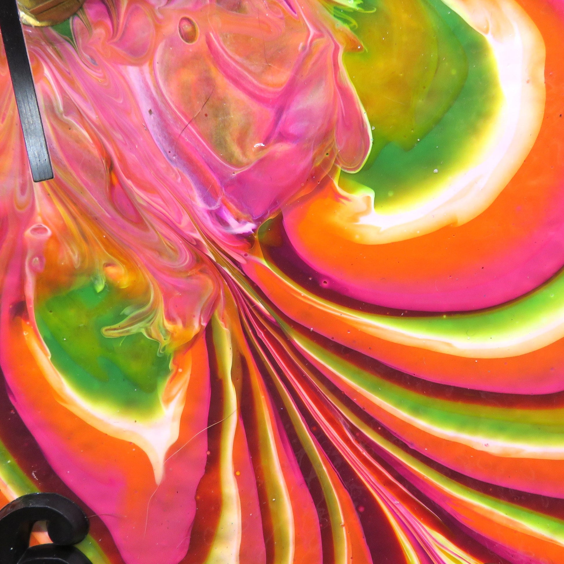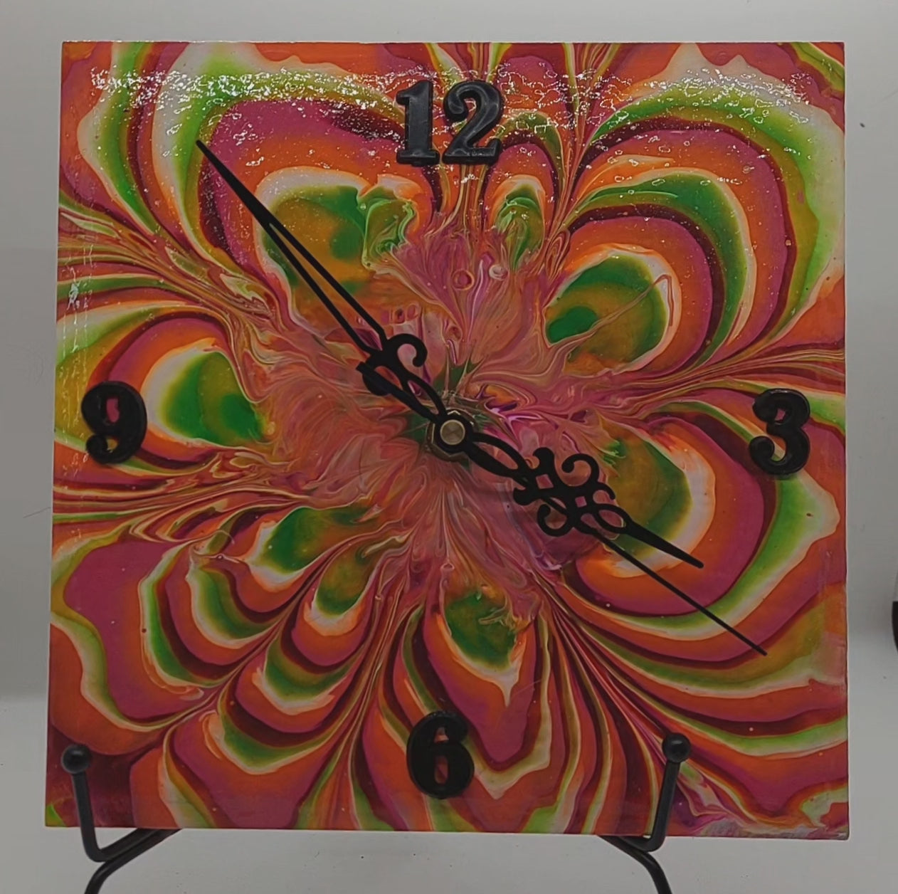 Handcrafted Neon Flower Pour Paint Clock, Upcycled 8x8 Ceramic Tile Wall Art