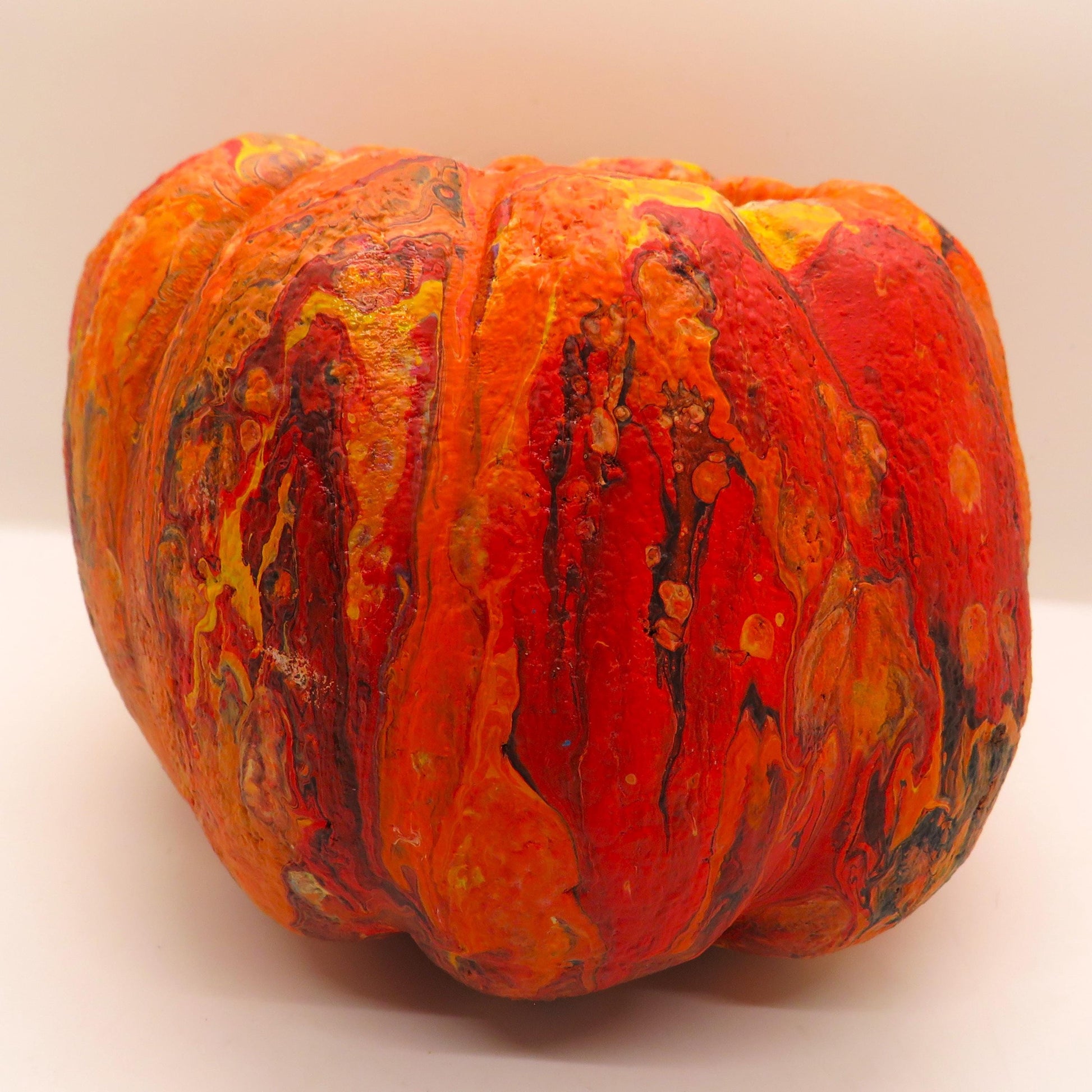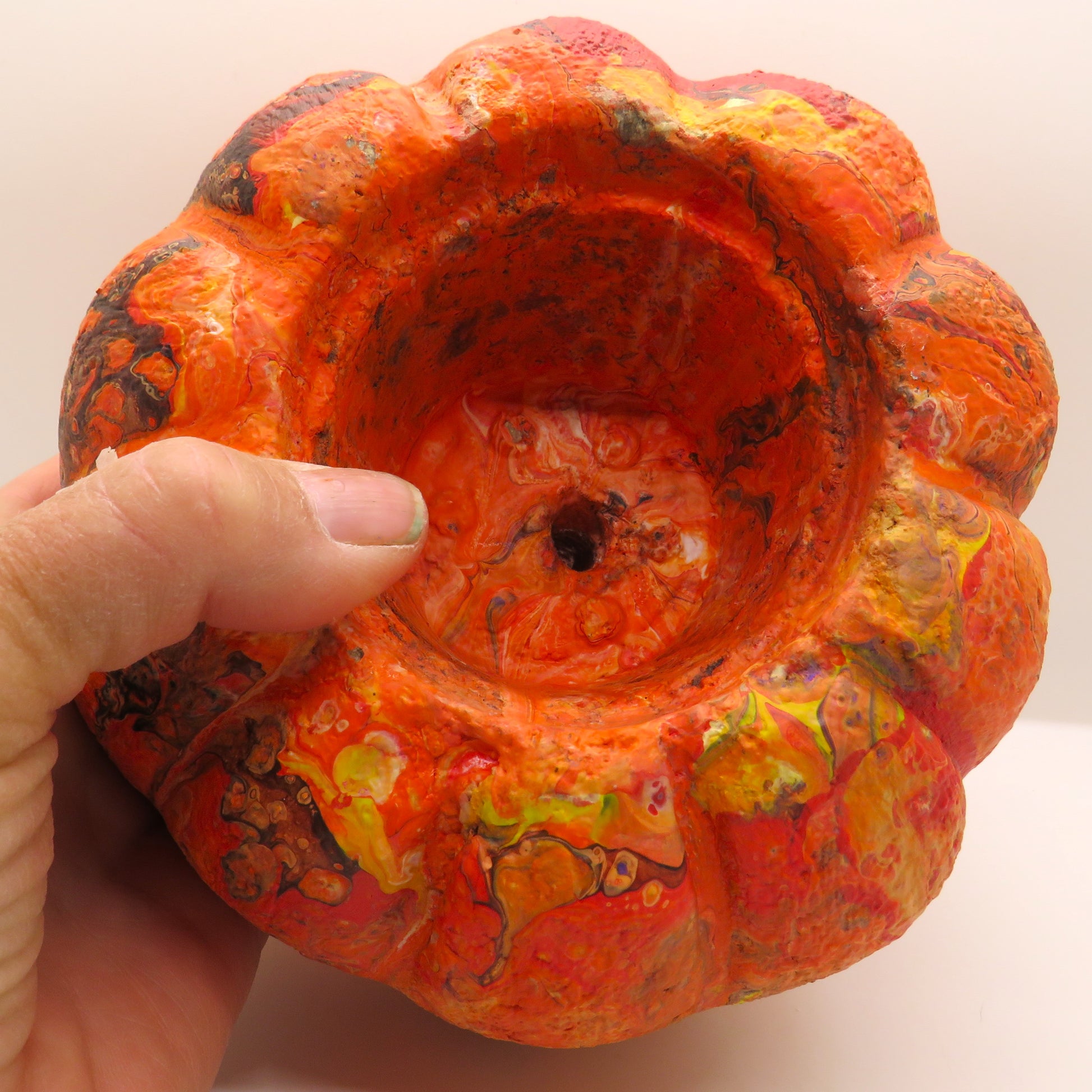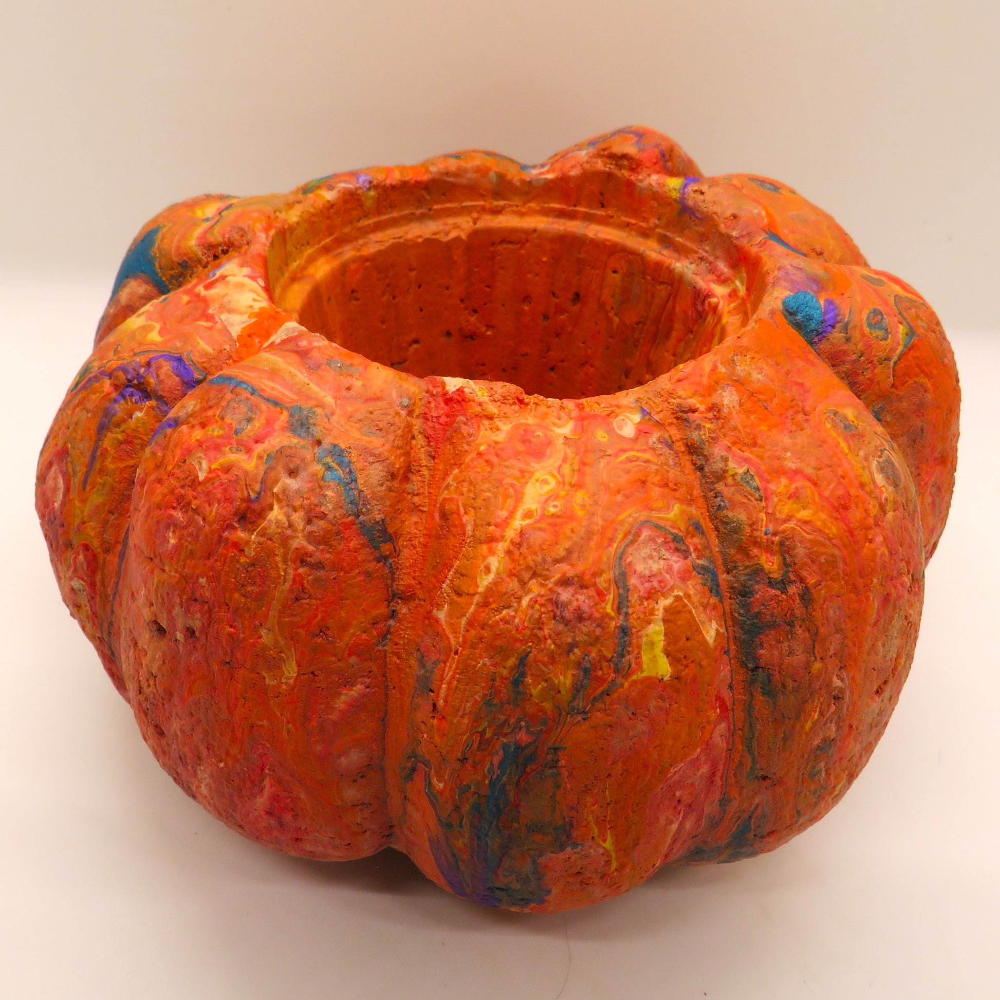 Add a touch of unique artistry to your home with these handmade hypertufa pumpkin planters, finished in stunning pour paint and sealed for durability. Each planter features a 3-inch pot opening, perfect for small plants or candles. Choose from two styles: Style A, which is larger and taller, or Style B, which is plumper. These planters are weatherproof, making them suitable for both indoor and outdoor use. Each piece is a one-of-a-kind fluid art creation that will enhance your Halloween or Thanksgiving decor. Buy now and elevate your festive decorations with these durable and beautiful pumpkin planters!