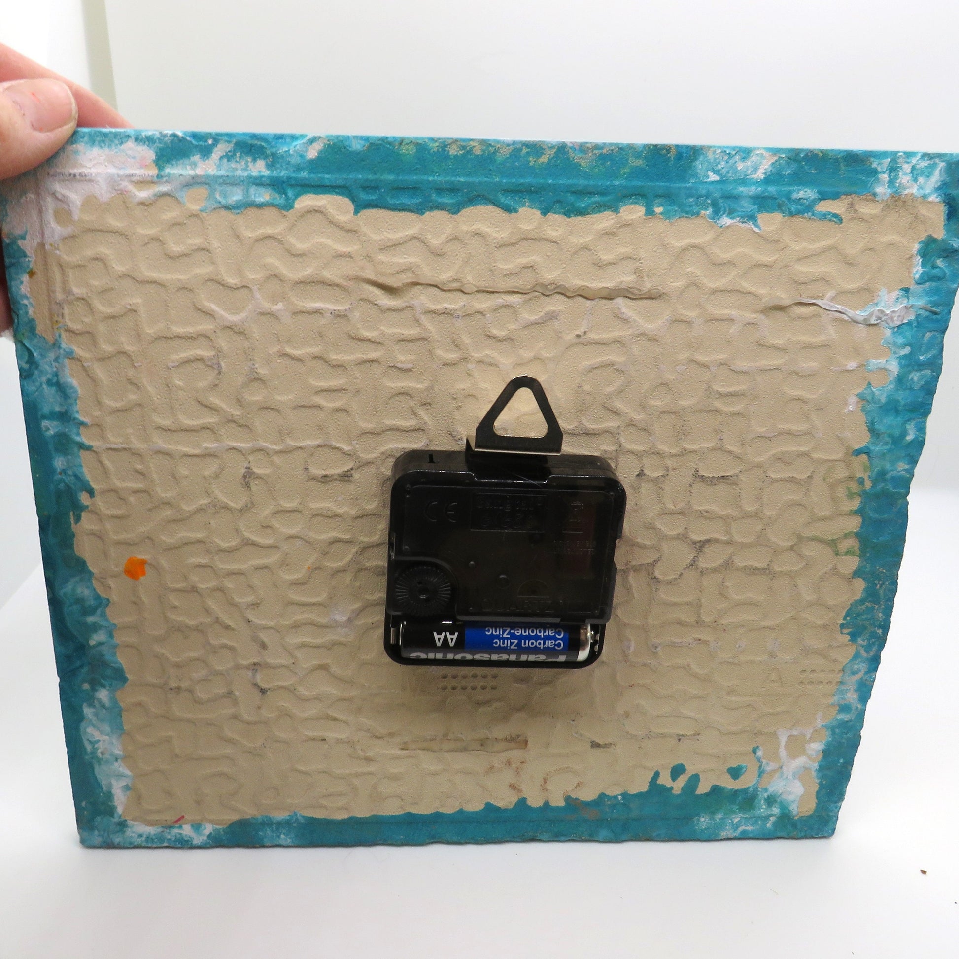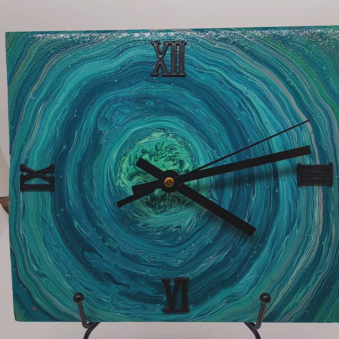 Handmade Teal Pour Paint Clock with Habitat Tile - Earth Day Art Decor 8x8 inches