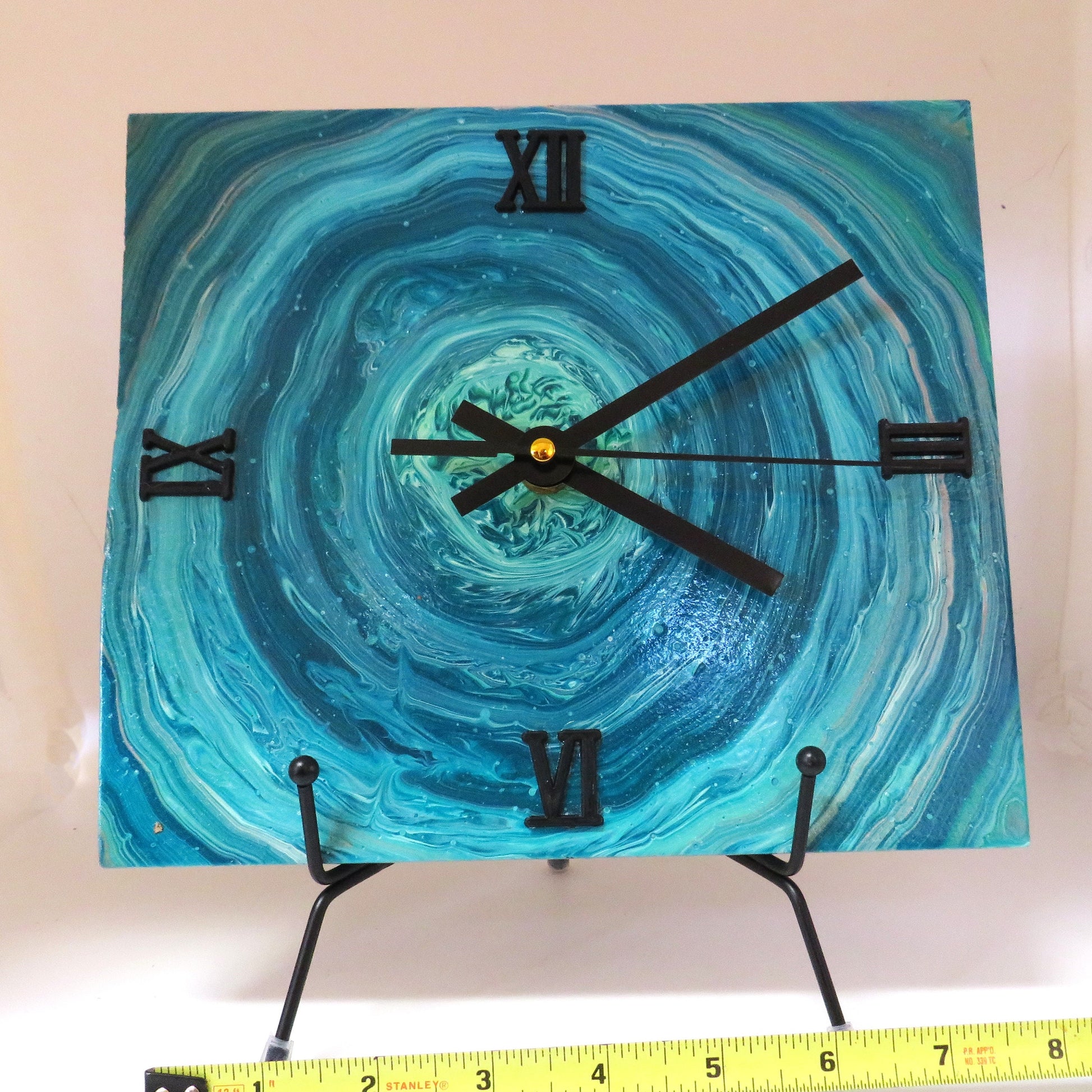 Add a touch of artistic flair to your home with this handmade teal pour paint clock featuring Habitat tile. The spiral-shaped pattern and vibrant colors make it a perfect choice for Earth Day or any day of the year. Measuring 8x8 inches, this functional art piece is sure to be a conversation starter in any room. Each clock is unique and made with care, making it a one-of-a-kind addition to your decor. 6X8 inch size.