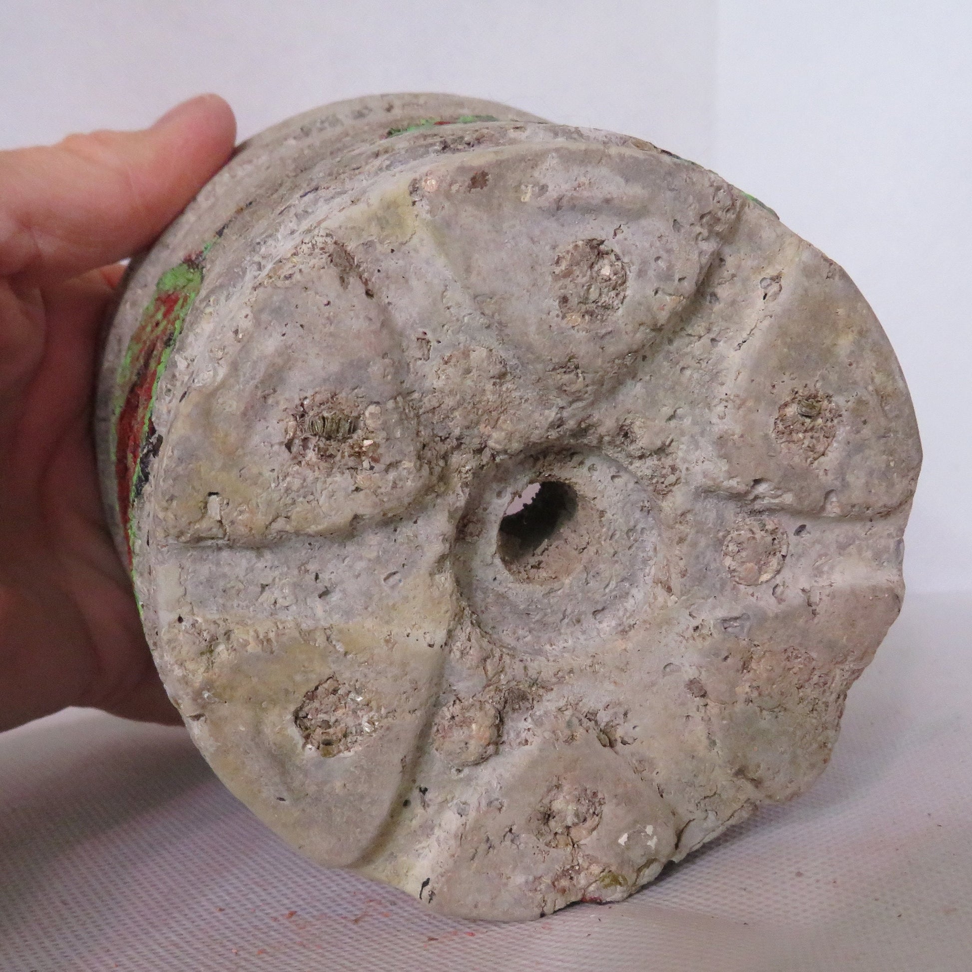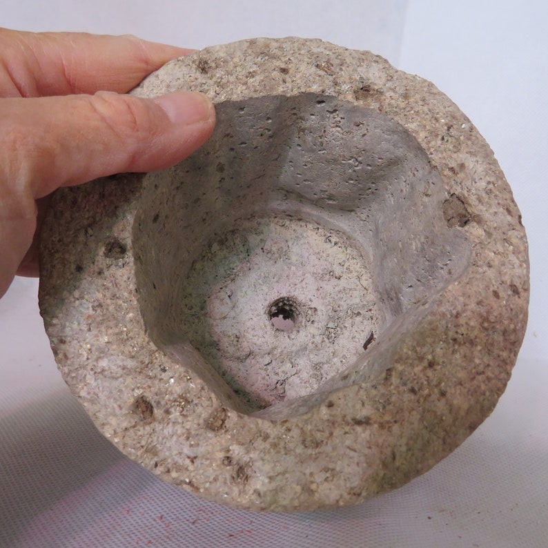 Hypertufa is made with Portland cement, sphagnum moss, and vermiculite. After curing for several weeks/months, the material resembles rock. The finished product is sturdy like cement but weighs about 1/3 as much. This planter has a thick bottom and walls to make it durable. Hypertufa is porous (similar to terra cotta) and allows plants to breathe. The pot can withstand freezing but due to its size, it is recommended to bring in indoors during months with an outdoor freeze.