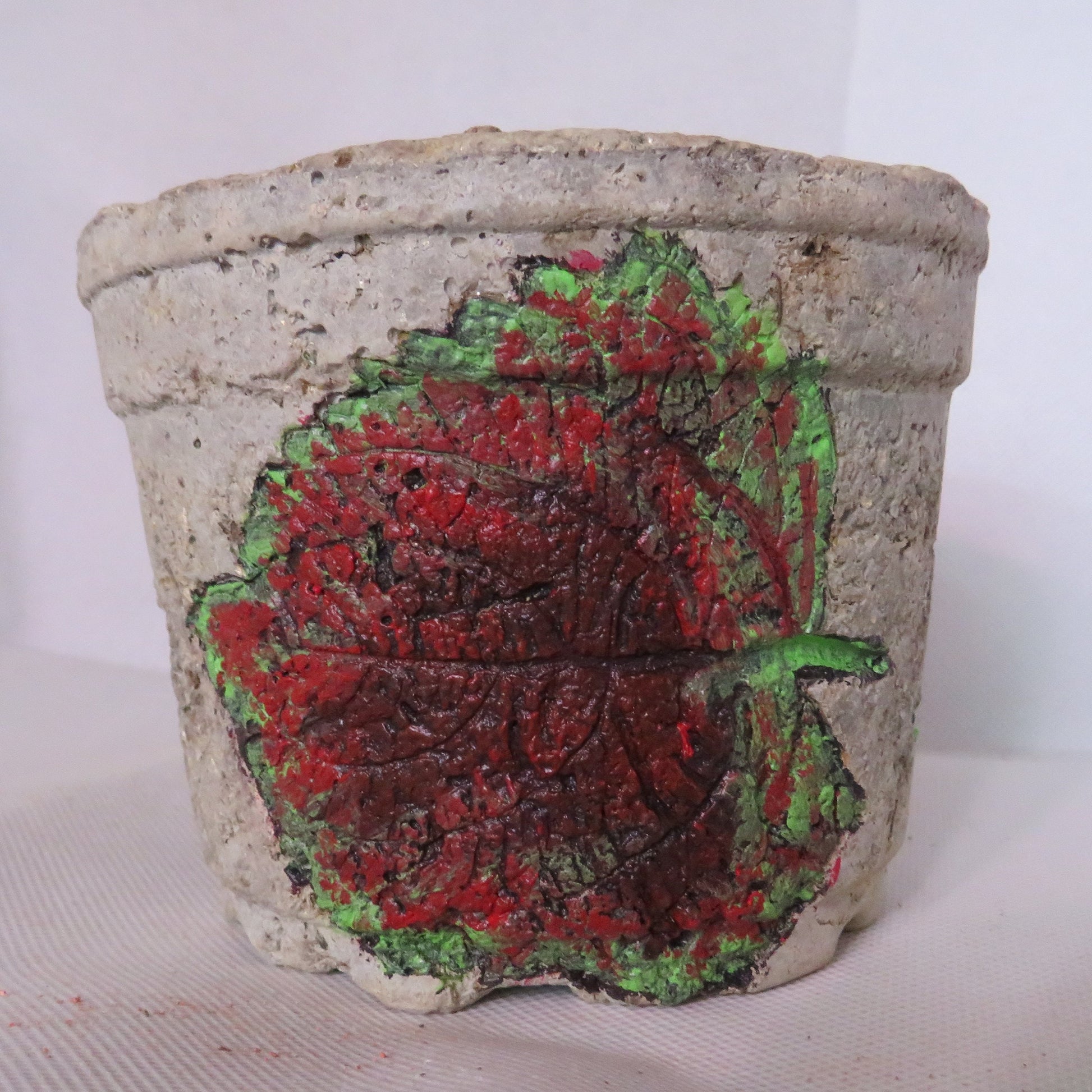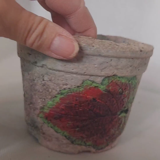 Discover the charm of our rustic, handcrafted hypertufa planter, a perfect blend of natural tones and vivid colors. Each piece is unique, featuring three beautifully detailed coleus leaf imprints that stand out in radiant shades of red and green. With a comfortable 4.5-inch diameter and standing 3.75 inches tall, it's ideal for accentuating your indoor or outdoor space. The sturdy build and artistic design make it an attractive home for your favorite plants or a cherished gift for garden enthusiasts. Invite nature into your home with this one-of-a-kind planter that brings a touch of artisanal craftsmanship to any setting.